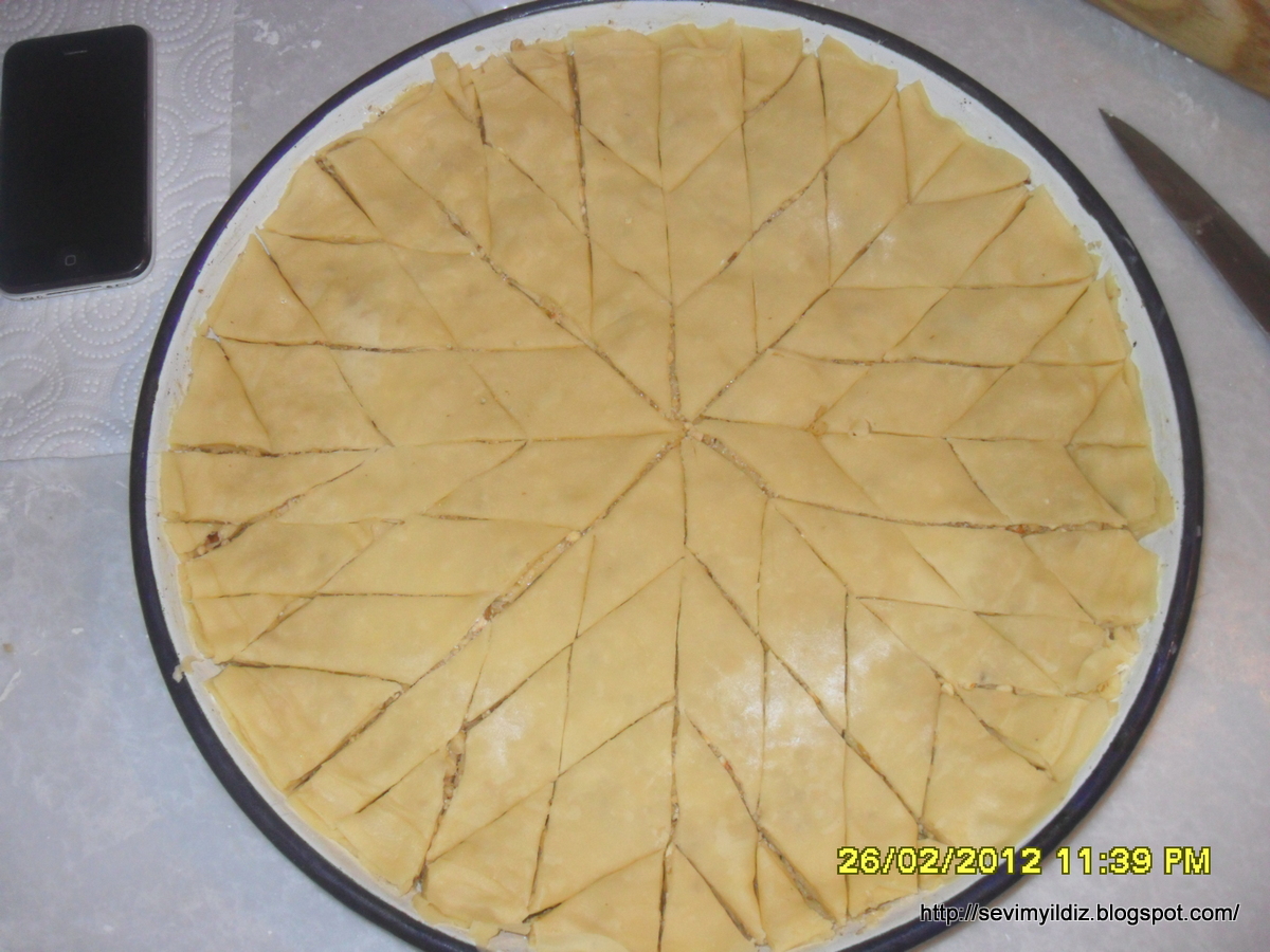 - açılan hamurlar tepsiye alınır üzerine cevizli karışım dökülerek yayılır