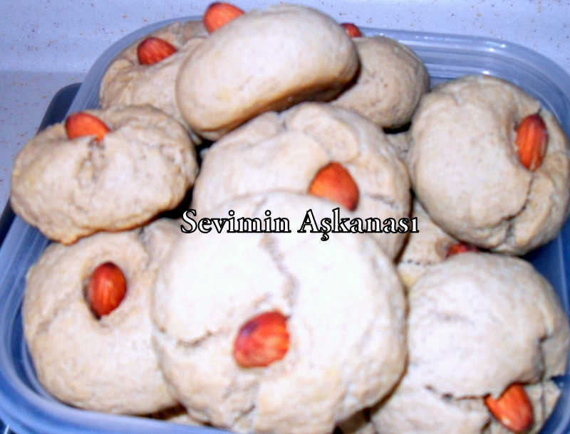 - Hamur toplarının üzerine birer badem yerleştirerek bastırın (tarifin aslında kahve çekirdeği vardı ama olmadığı için badem koydum)