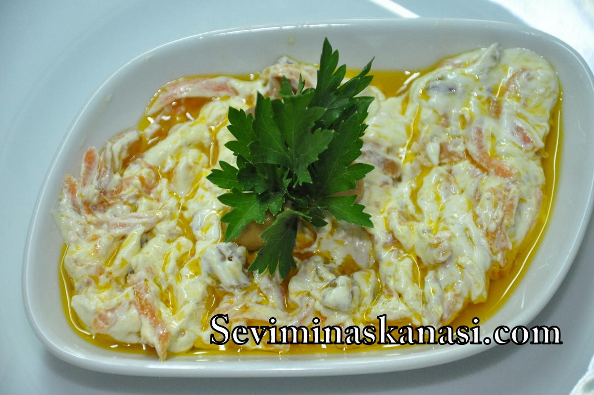 - soğuyan cevizli havuçları sarımsaklı yoğurda karıştıralım bu arada zeytin yağını ekleyelim